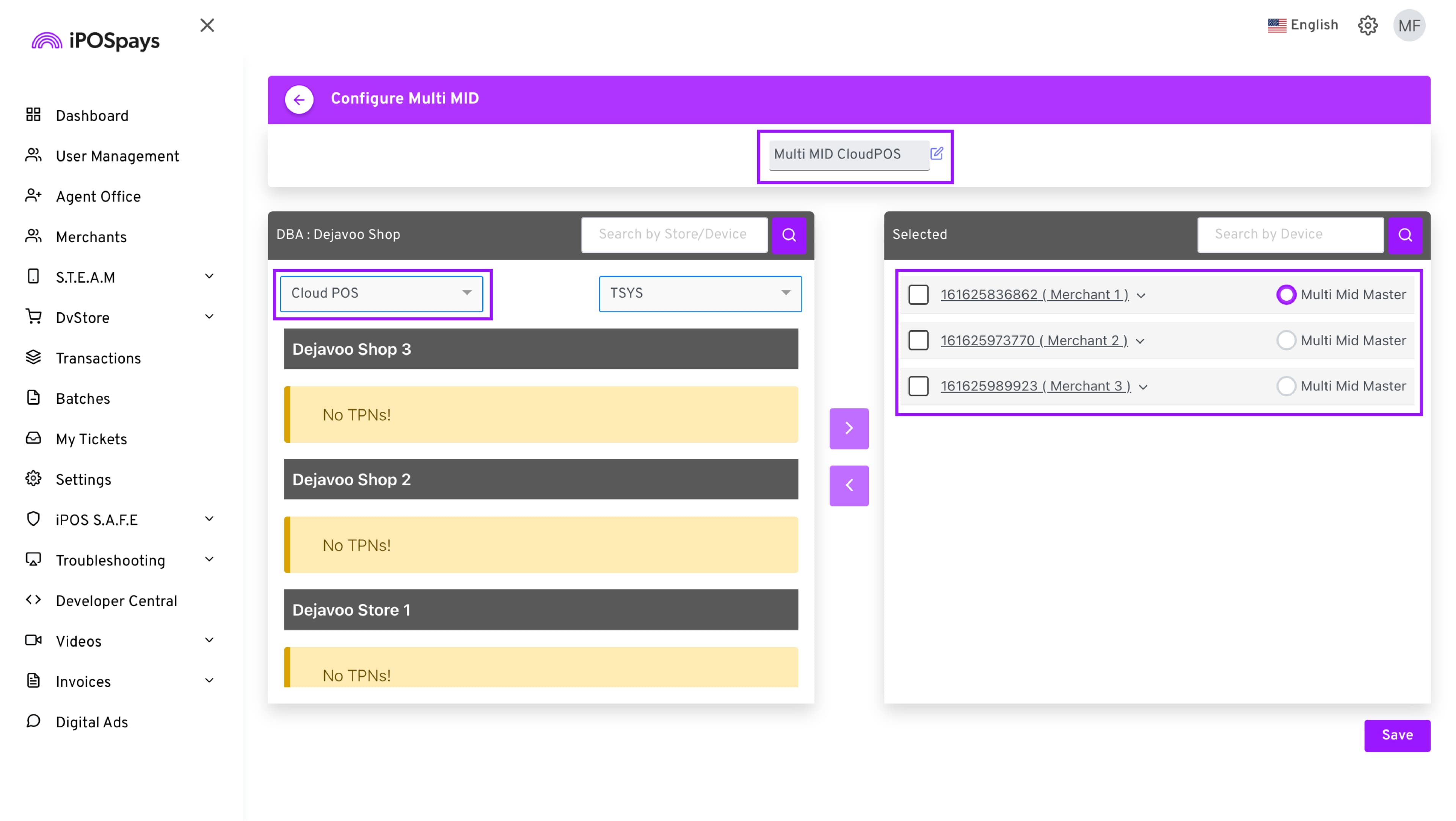 Follow the same steps as enabling Multi MID for POS terminals, but ensure the TPNs used are CloudPOS.