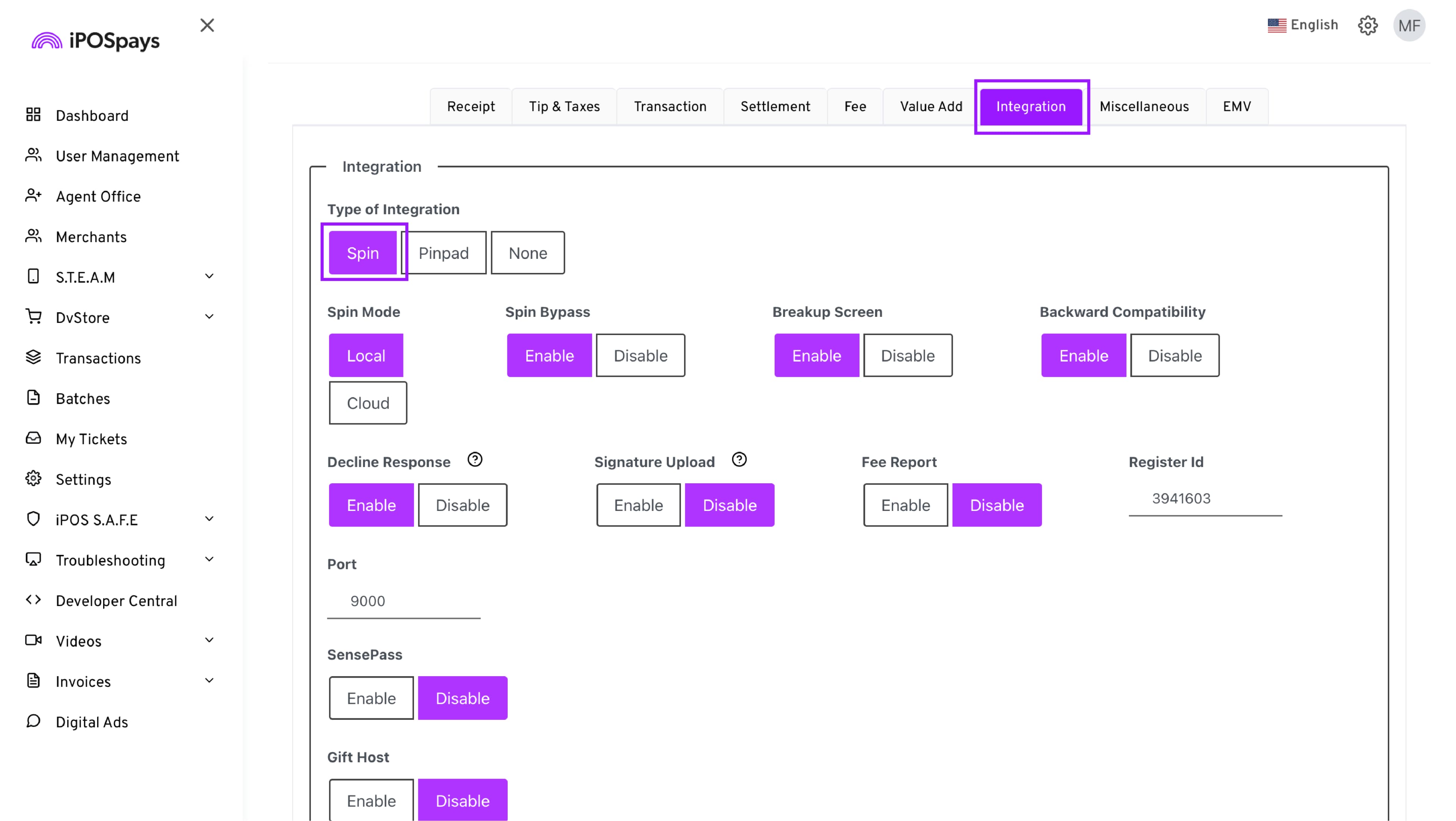 To activate CloudPOS Multi MID, SPIn must be enabled for the master TPN: