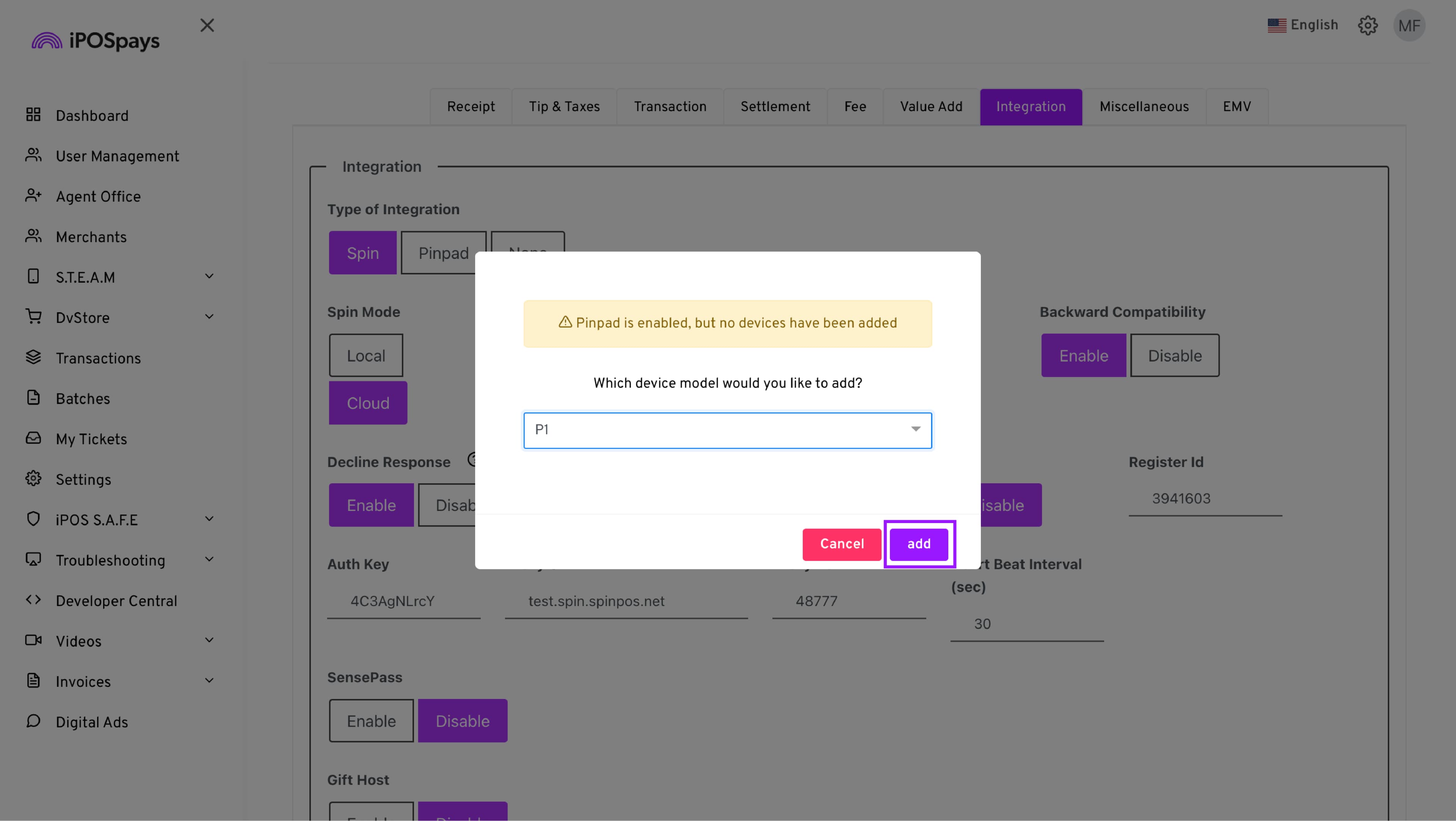 - Choose your PIN pad device from the drop-down menu that appears and click add.