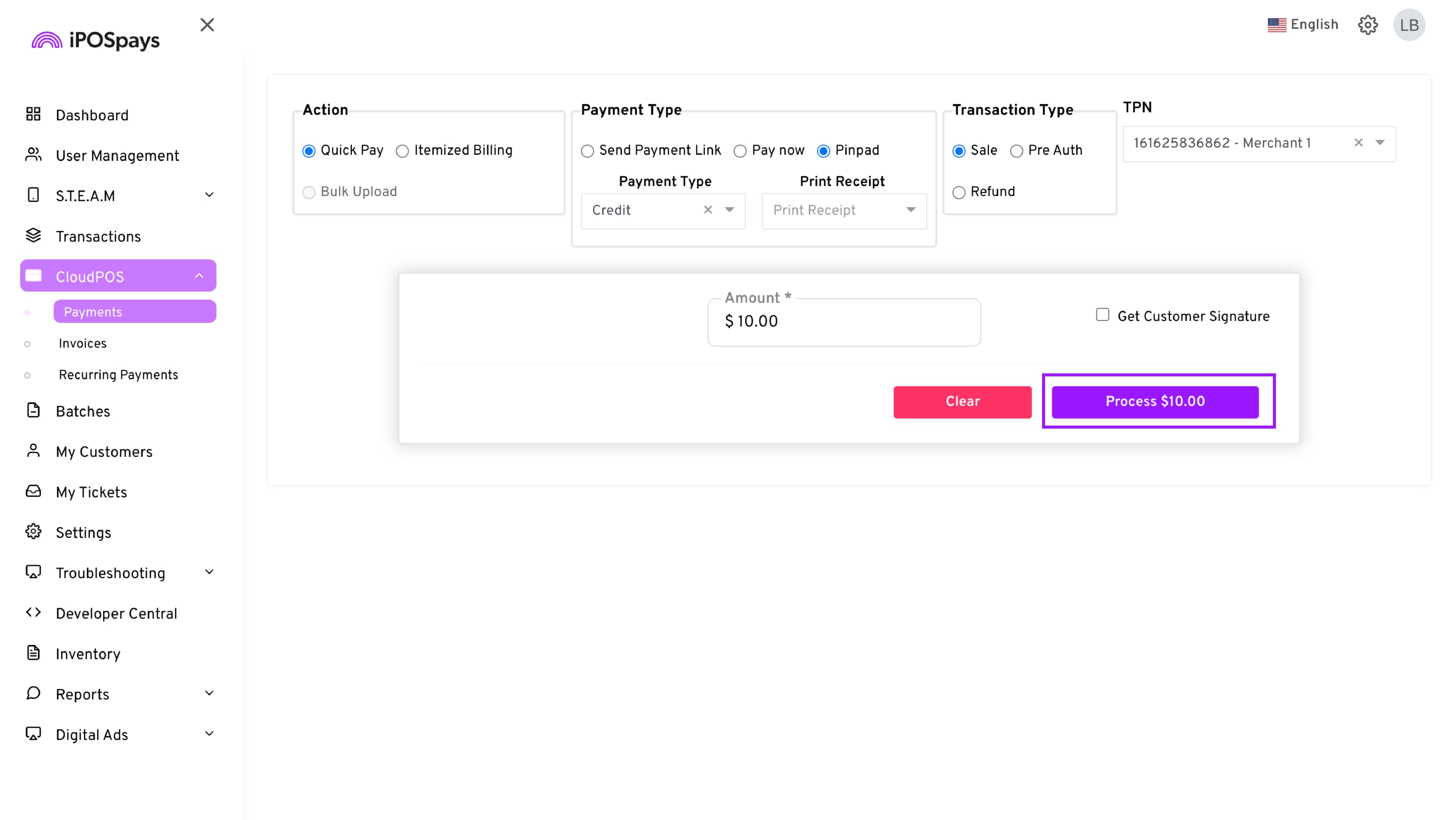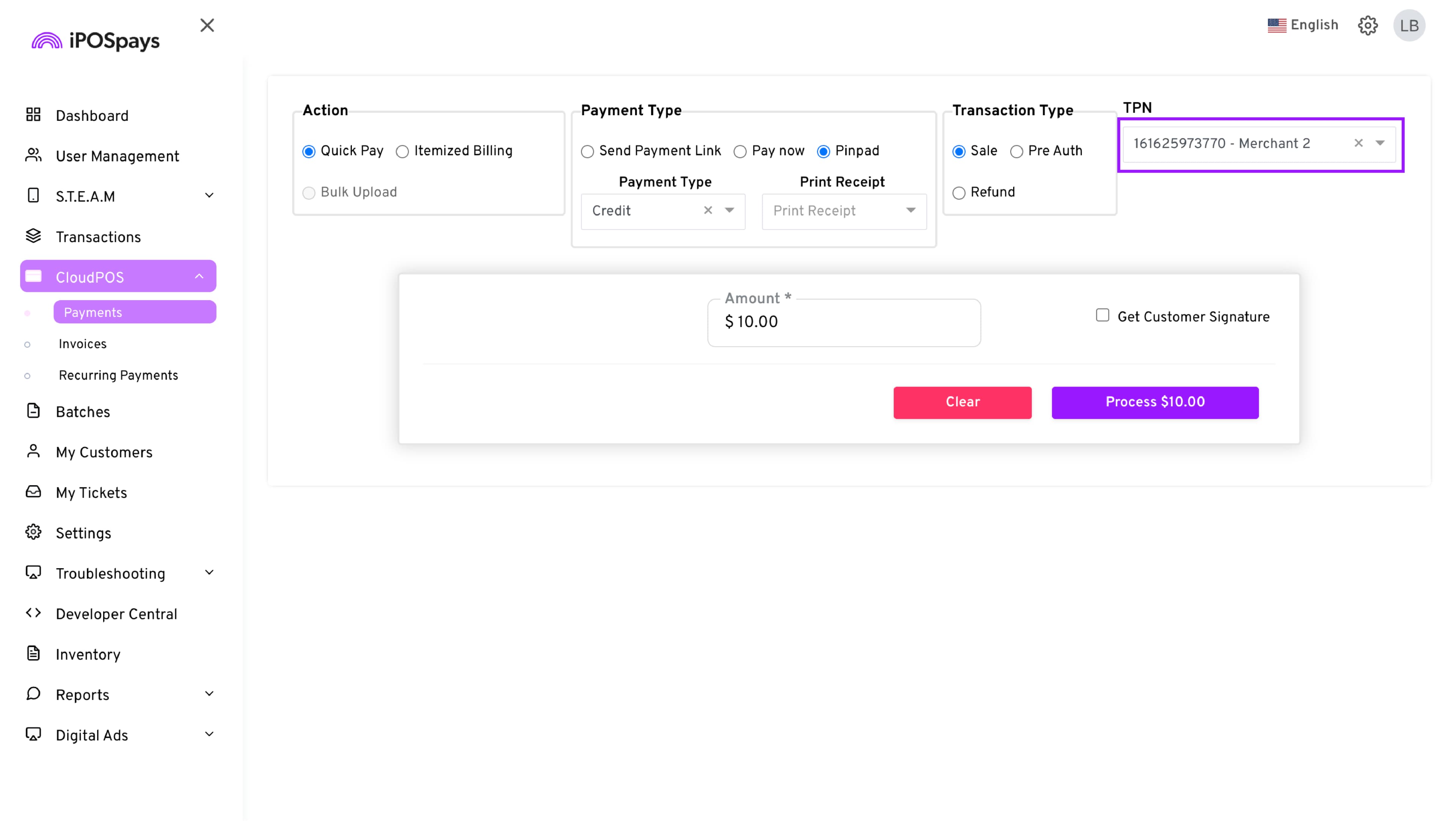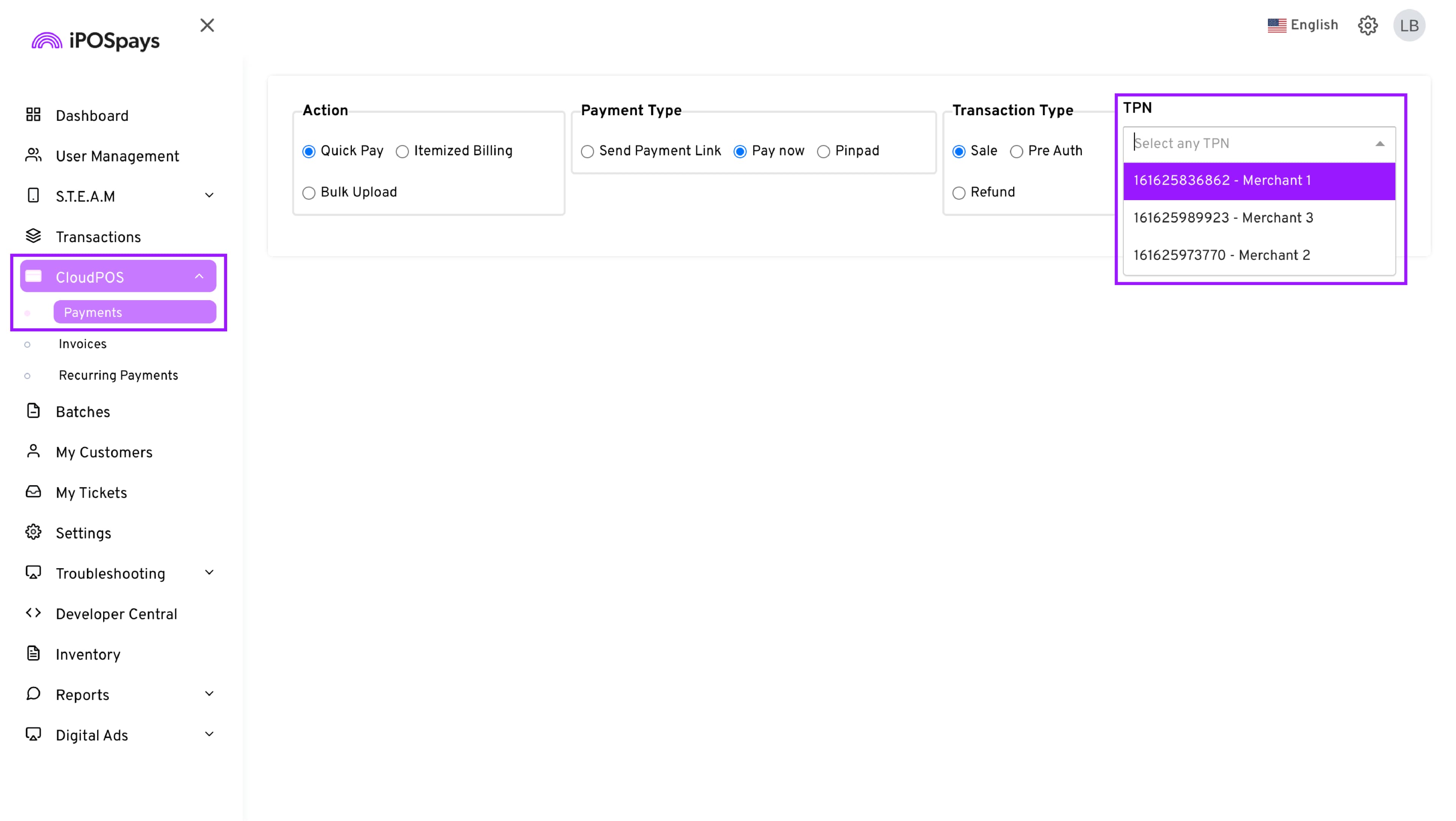 From the TPN dropdown, select the desired TPN linked to the MID you wish to transact with.
