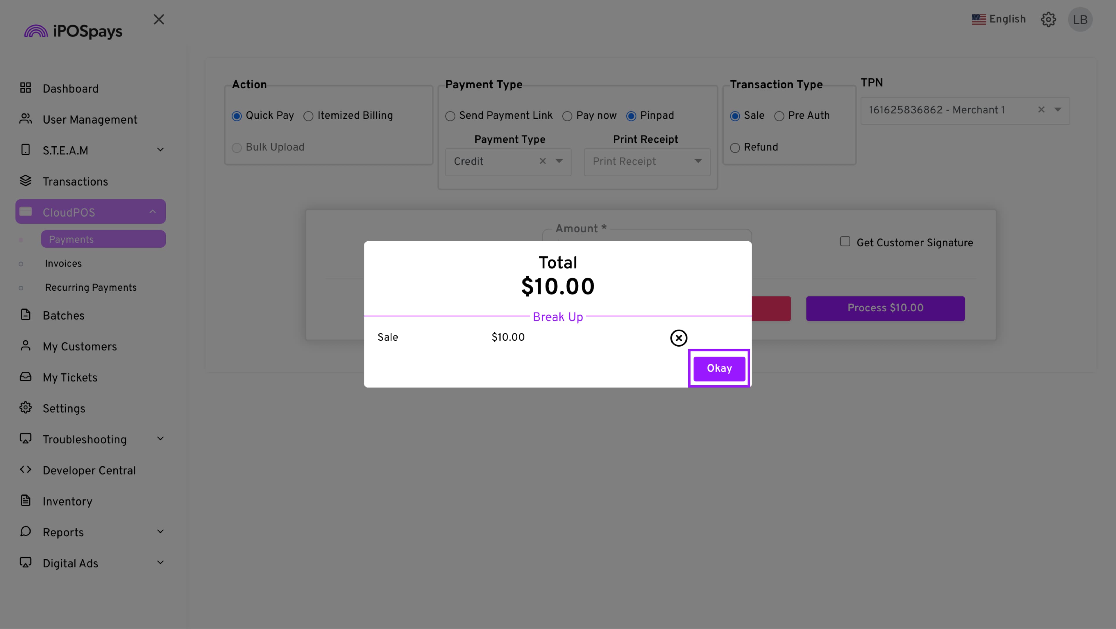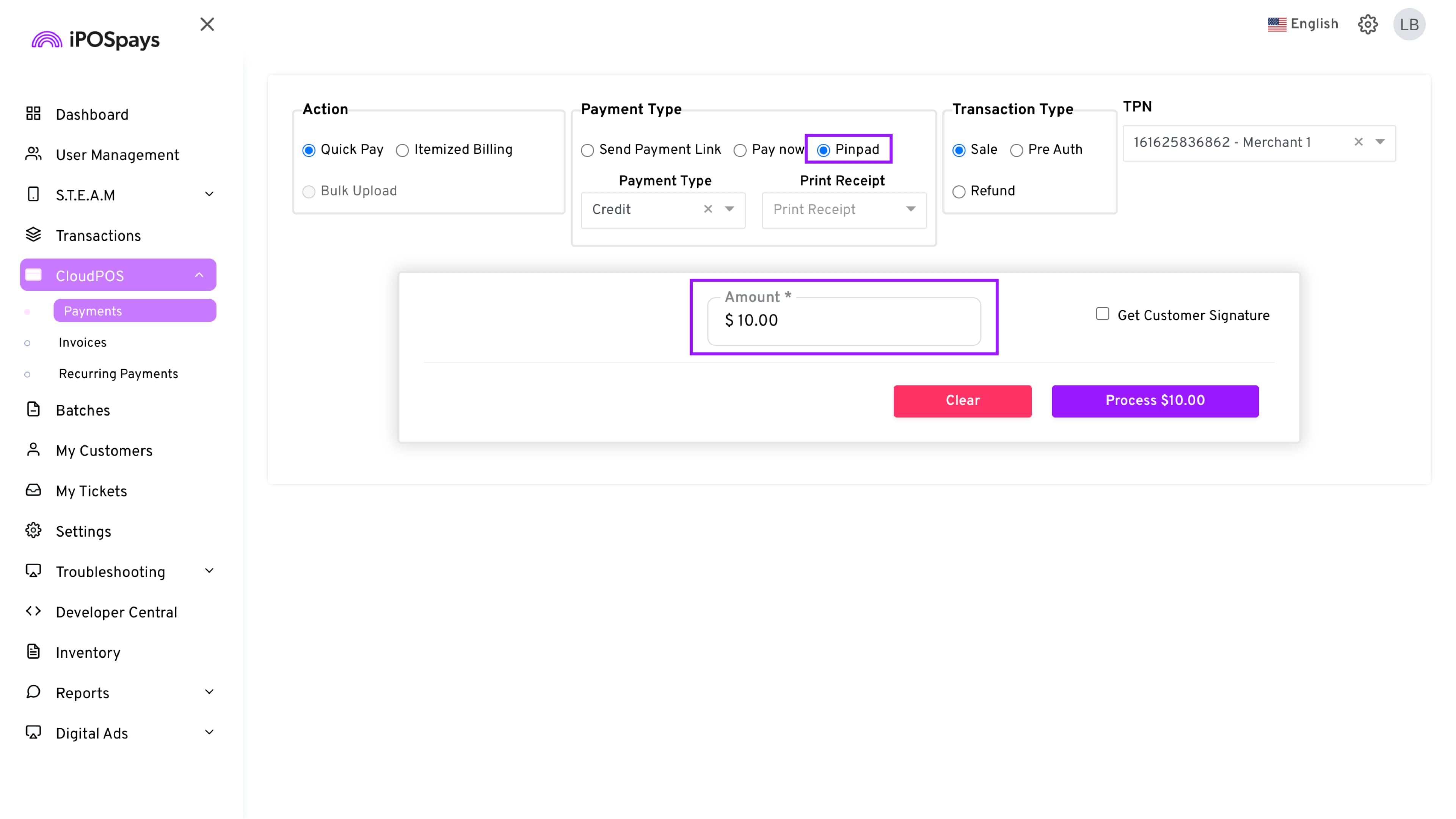 - Choose Pinpad as the payment type and enter the transaction amount.