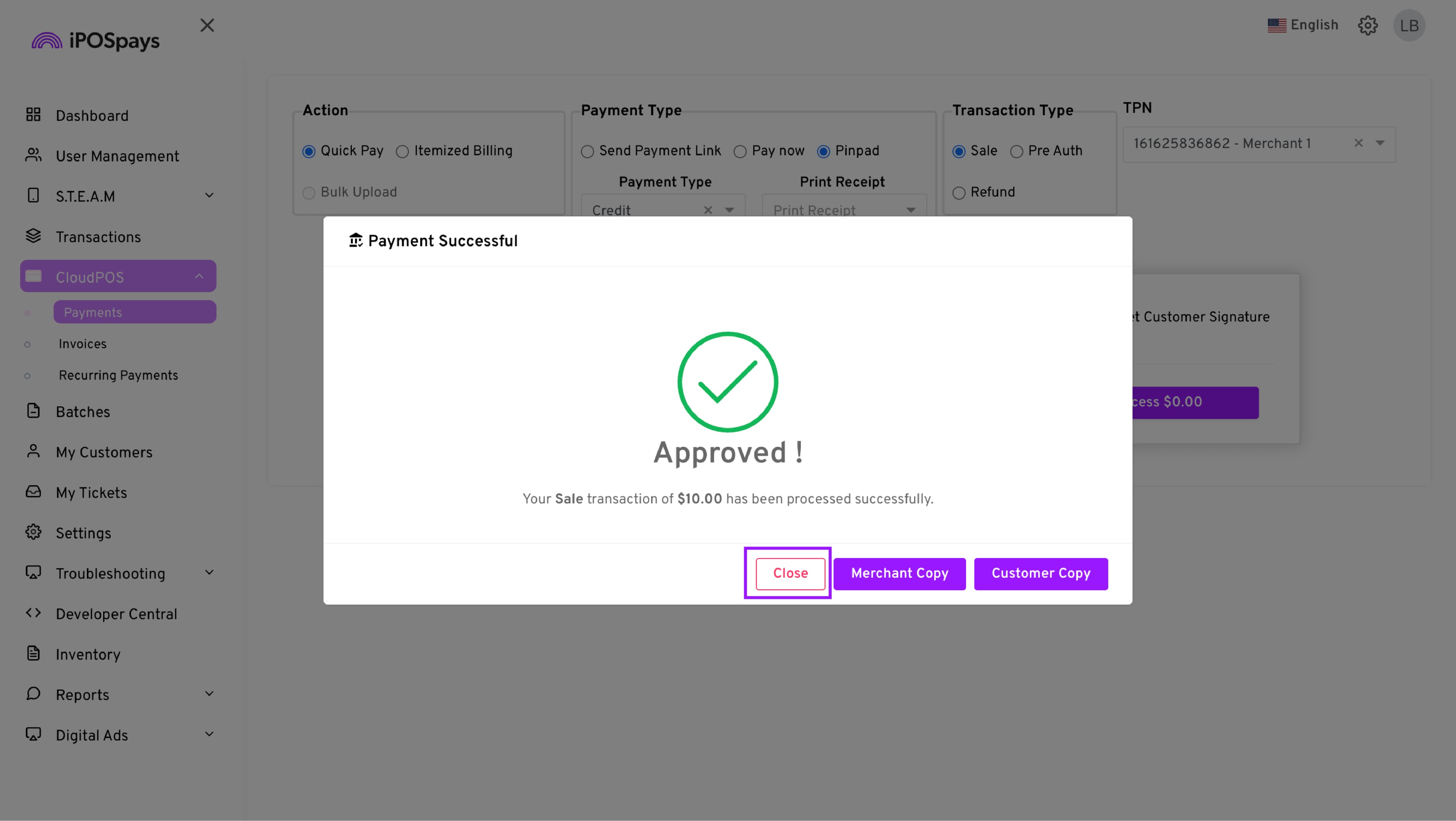 - To process a transaction for a different MID, select another TPN and repeat the steps.