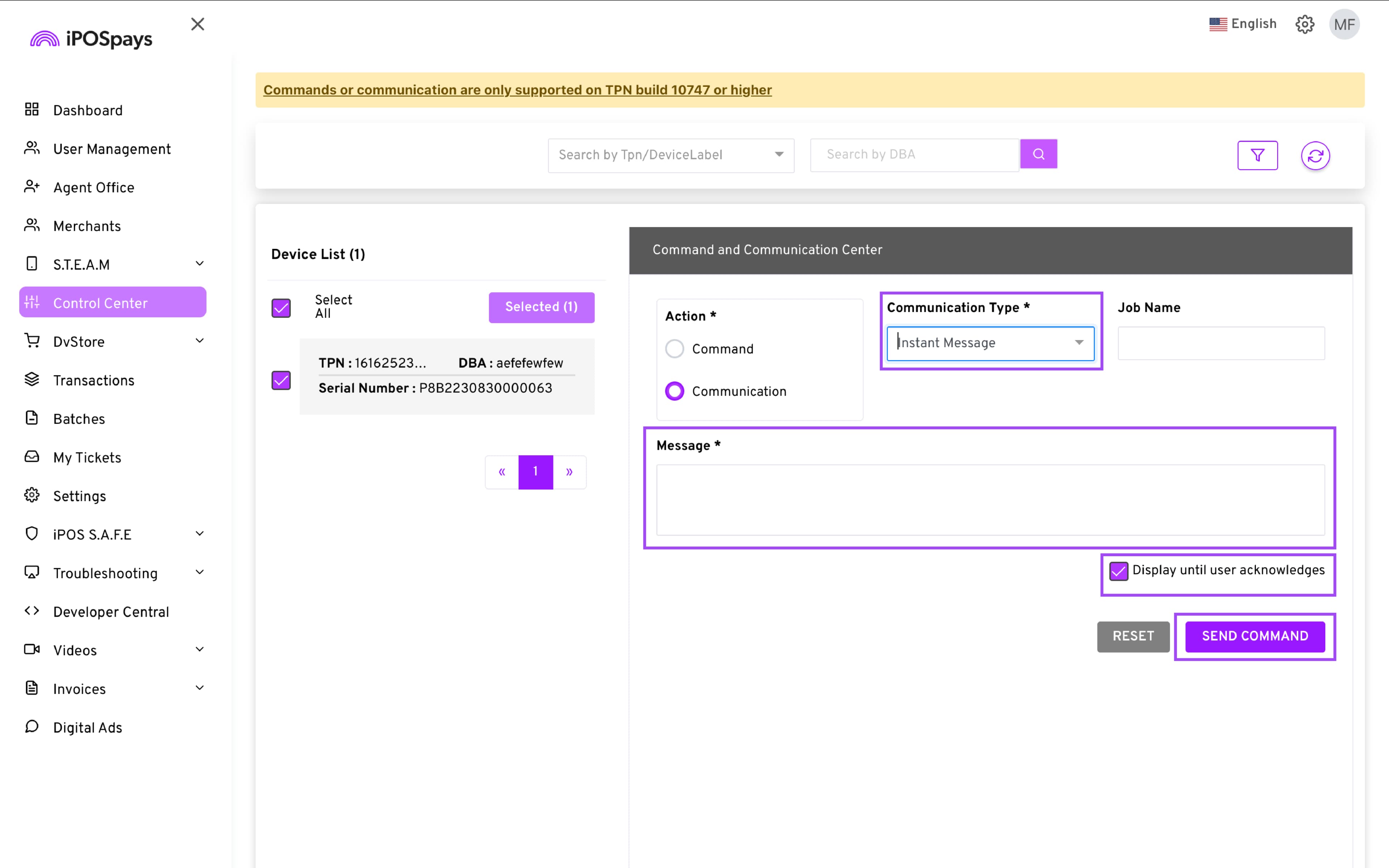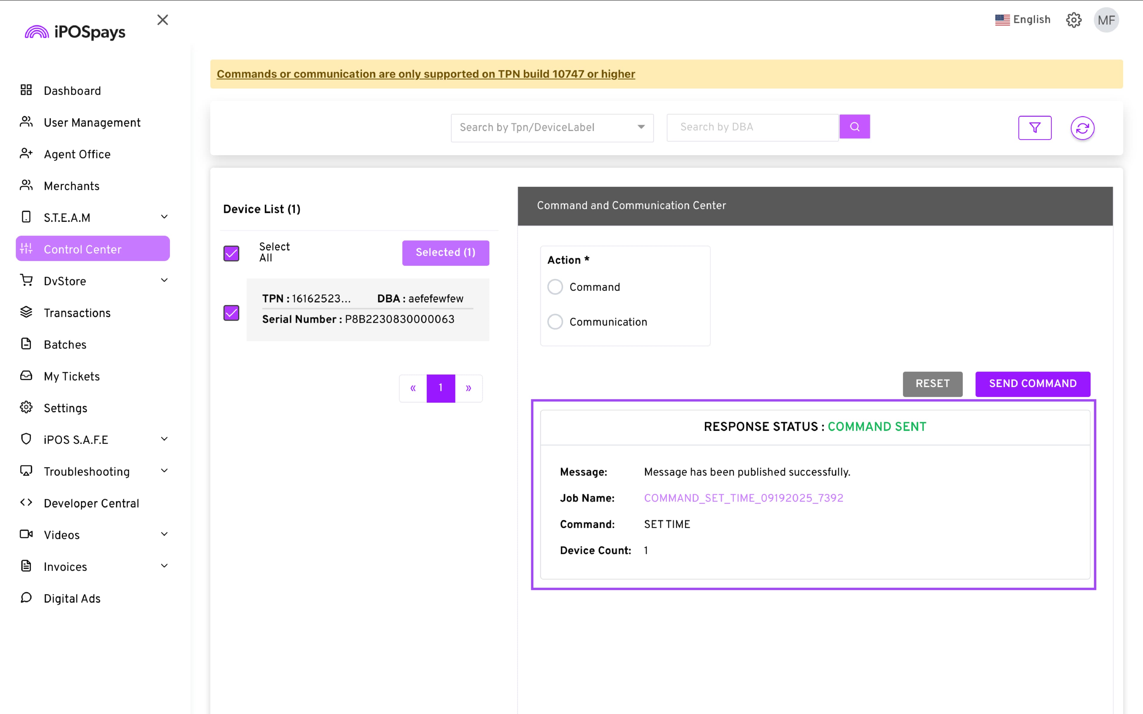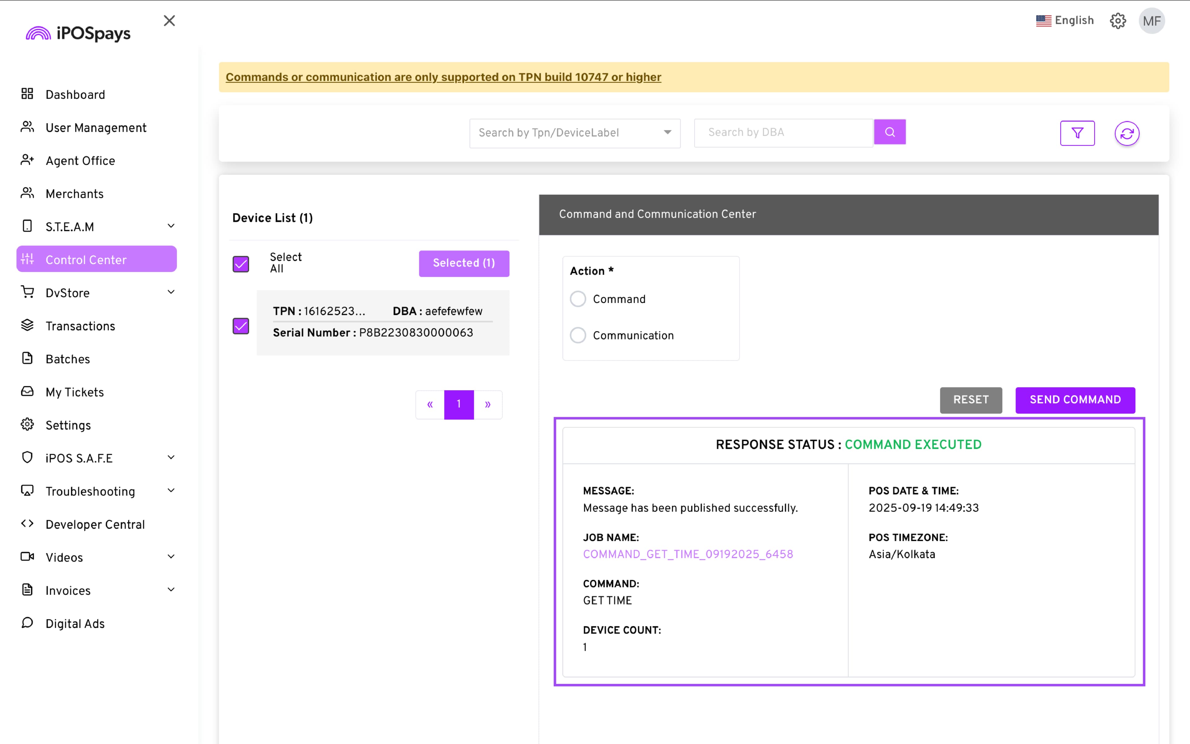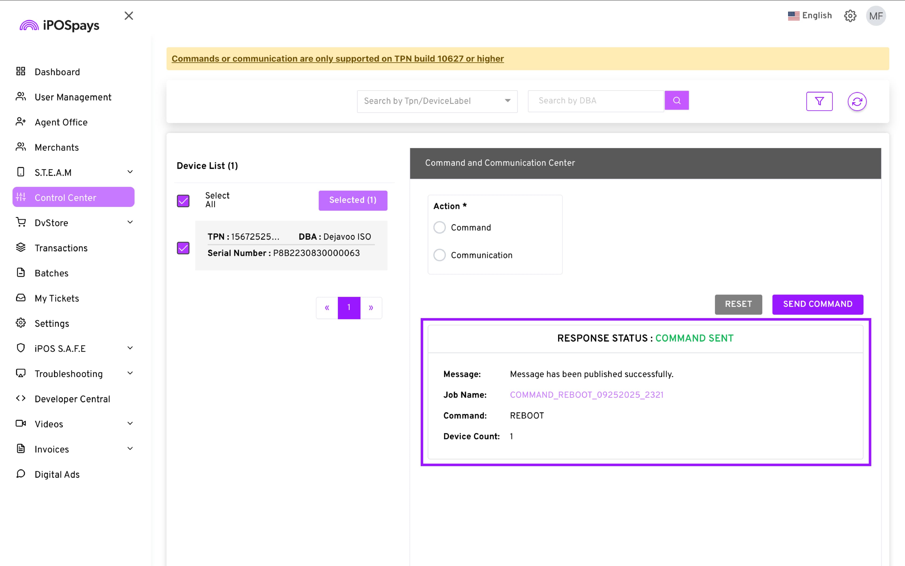 The Command and Communication Center is a feature on the iPOSpays portal that enables ISOs (Independent Sales Organizations) to remotely control merchant payment terminals and communicate with them by sending commands or messages.