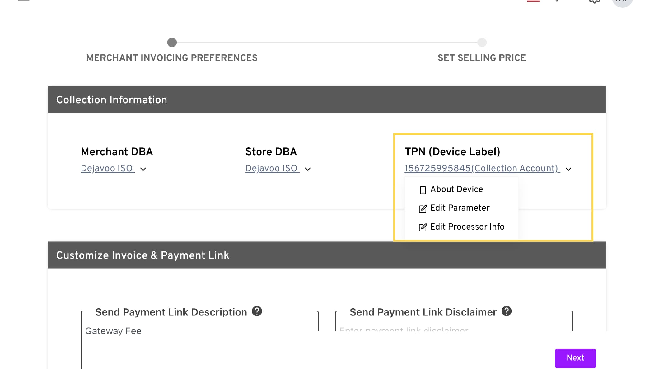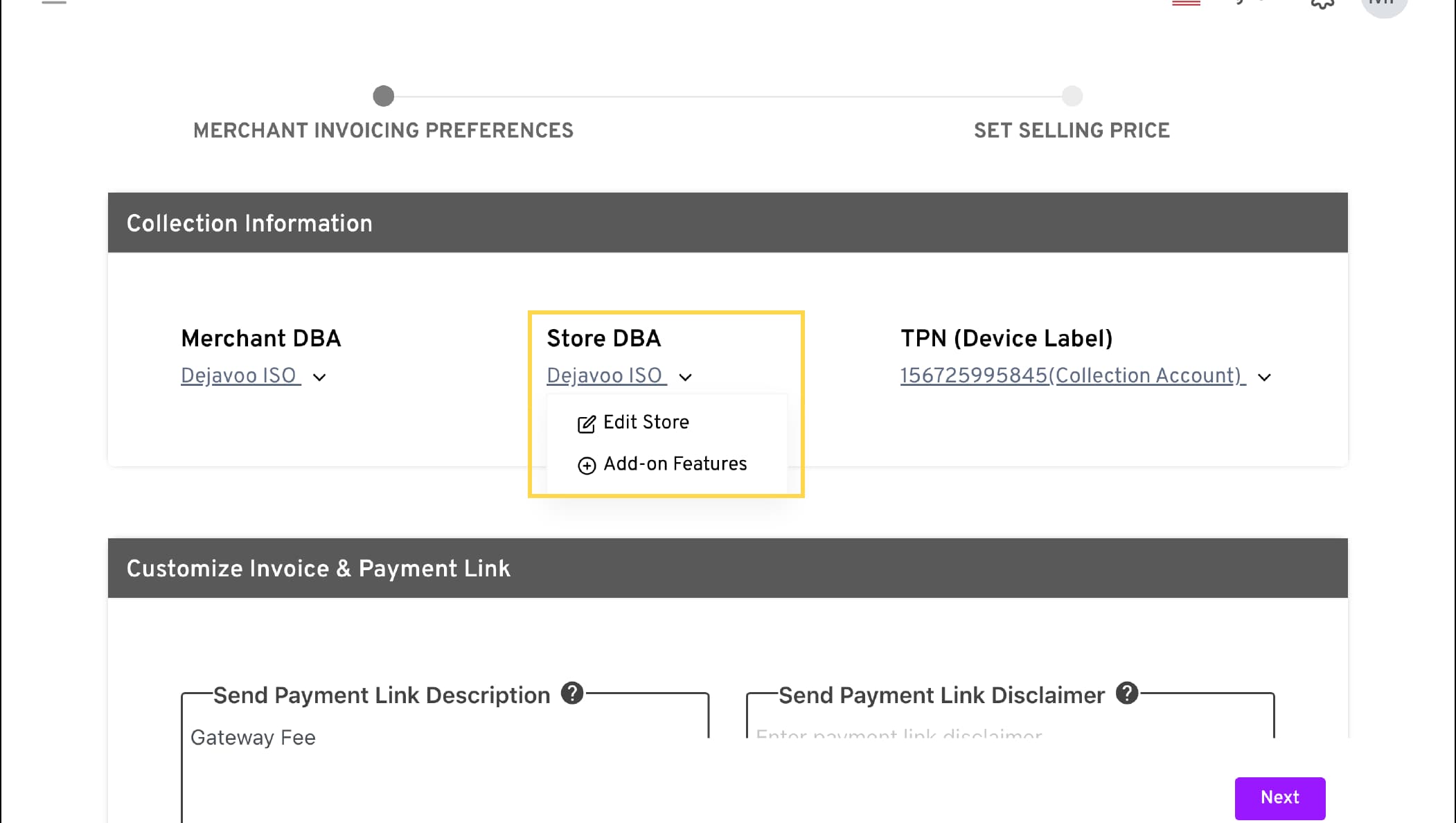 Click on their DBA → Edit Invoicing. You’ll land in the edit invoicing tab for this specific merchant.