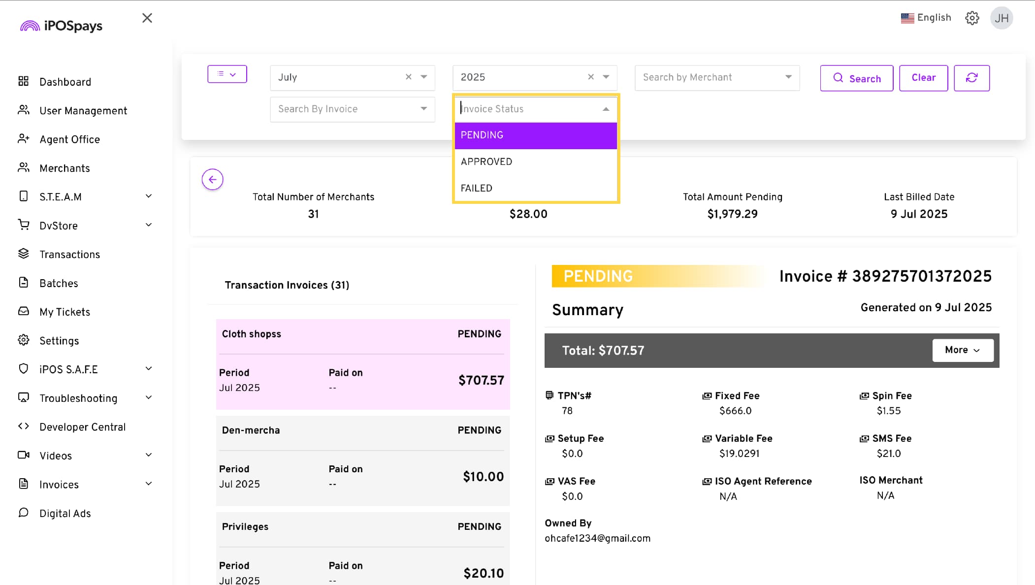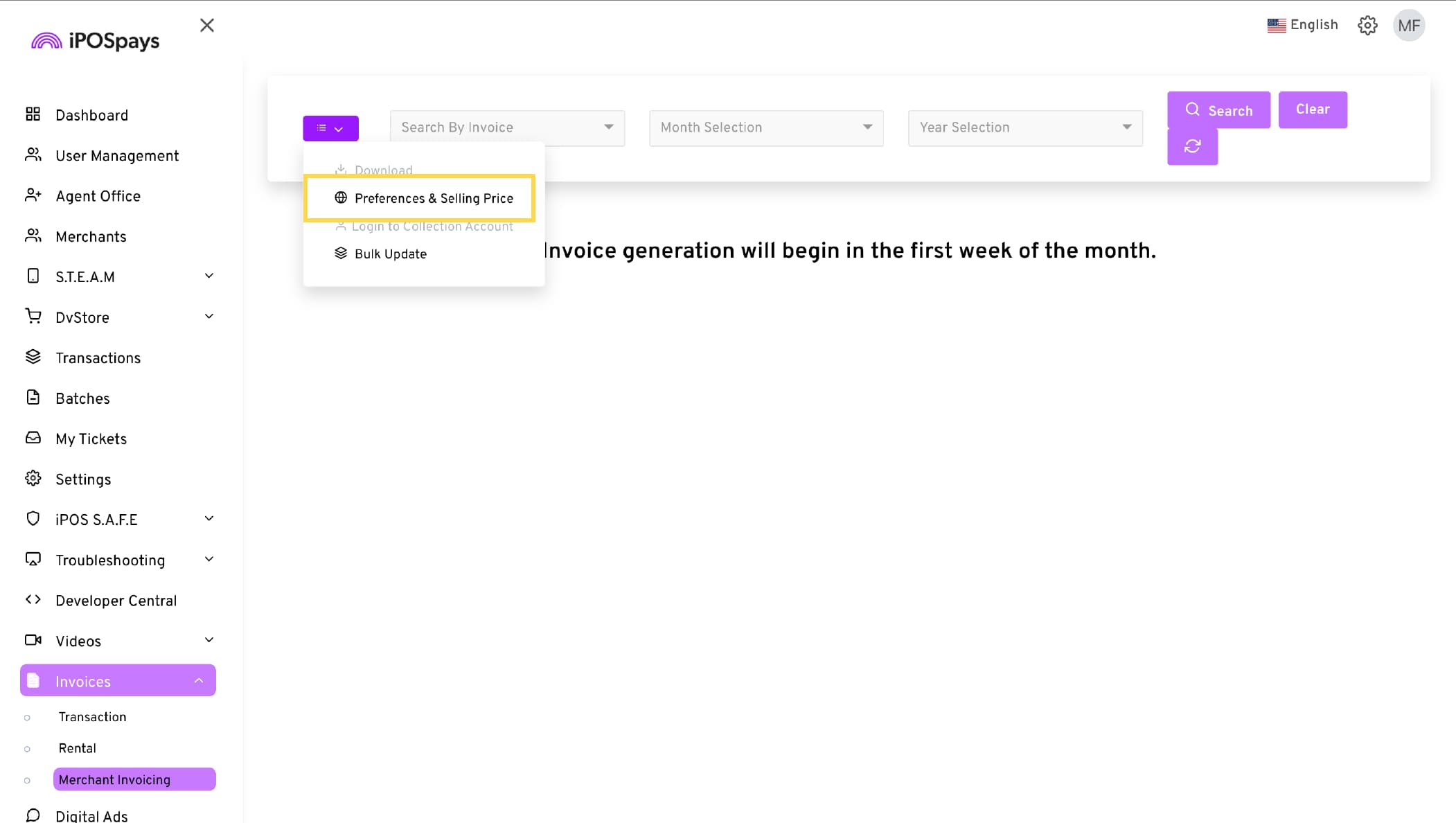 The Merchant Invoicing module has filters and additional information about the invoices generated. To do this,
