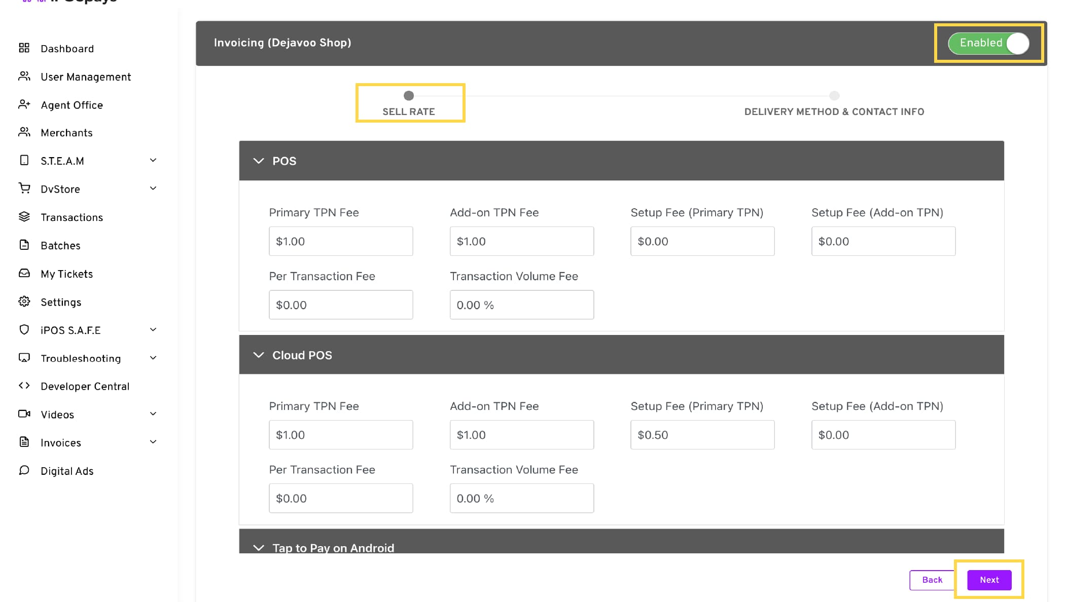 Define the selling price for each service. The prices set for your ISO account and iPOSpays services are automatically carried over and prefilled here. You can adjust these prices and charge your customers as you prefer.