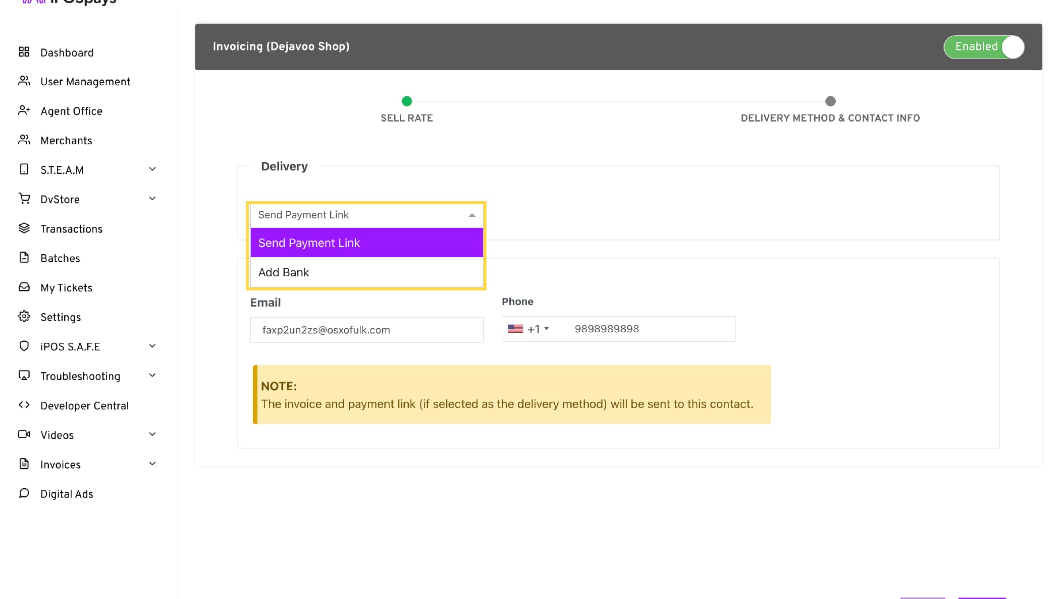 a. If the merchant enters card or ACH details through the payment link, the delivery method will automatically update to that option.