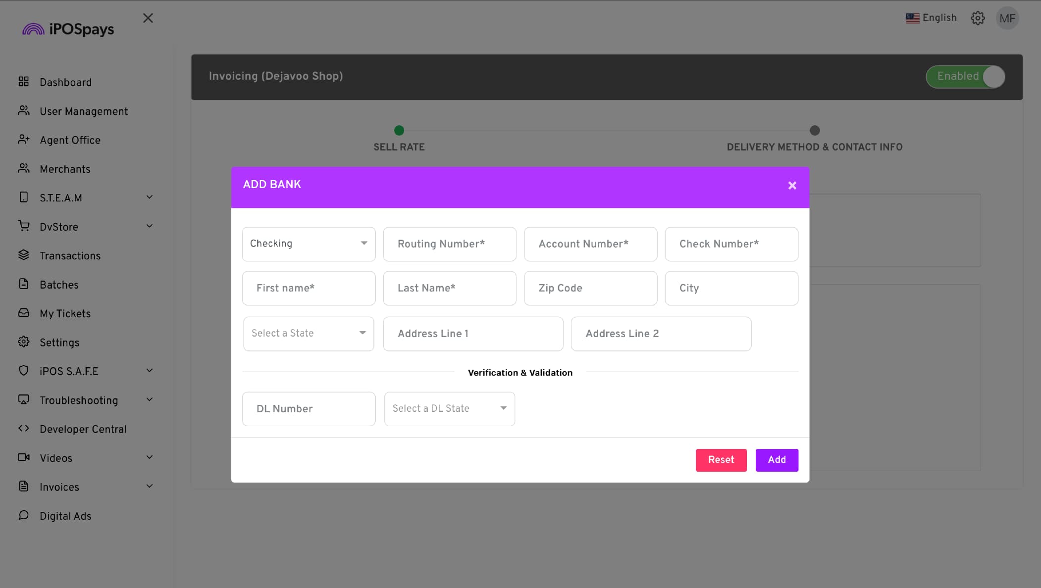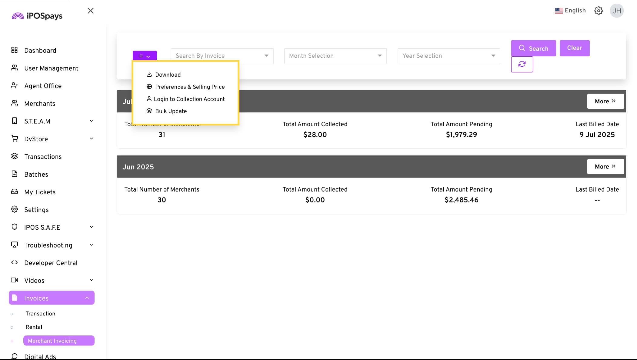 In the Merchant Invoicing module, you have the option to log in as your merchant into your collection account. If this feature is not enabled for you, contact your Dejavooo representative to enable it for you. If not, this feature will remain inaccessible.