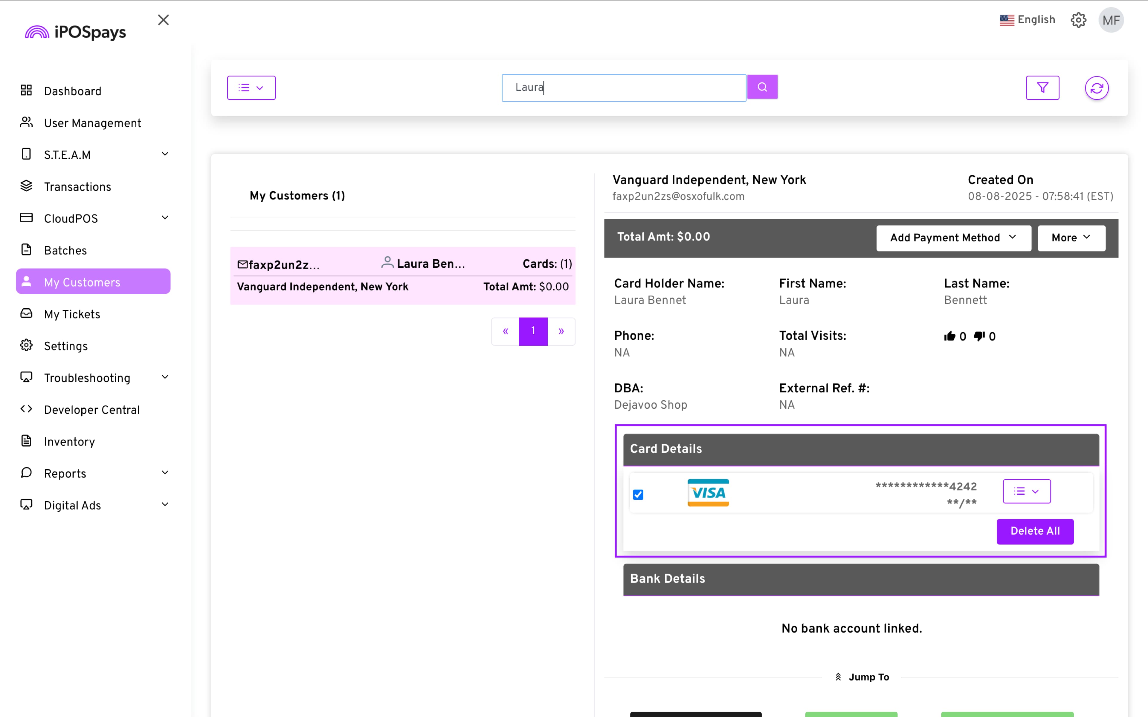 If the merchant enters their card details during a Send Payment Link transaction, those card details will automatically be saved and used as the default payment method for the next invoice.