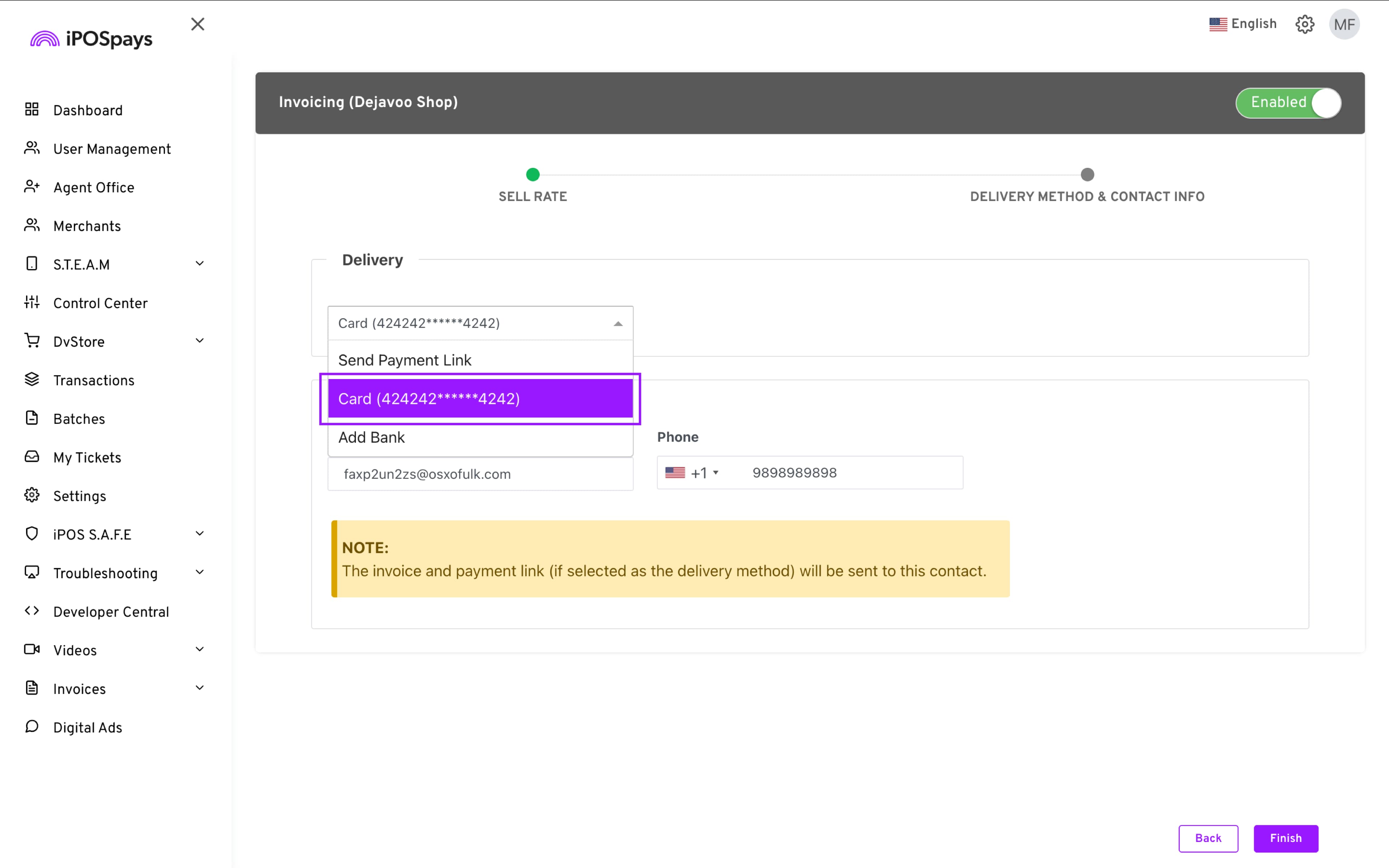 g. Return to the Invoice Delivery Method in the ISO account. The Card option will now appear, and you can set it as the payment method.